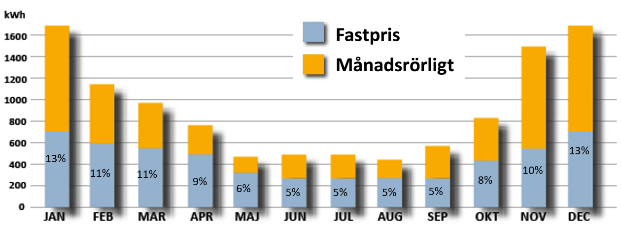 Varje månad debiteras nedan angiven procentsats multiplicerat med hälften av de senaste 12 månadernas förbrukning med fastpris. Exempel om din totala årsförbrukning förra året var 11.000 kWh, kommer du i december att debiteras (13% x 5.500 kWh=) 715 kWh med fastpris.